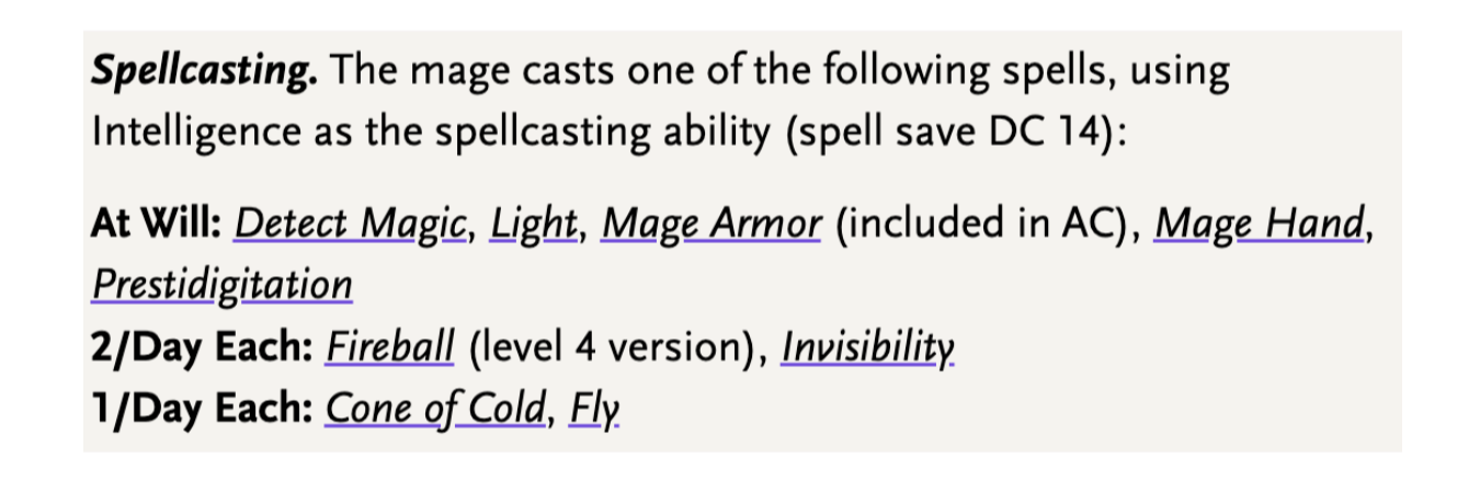 He’s based on traits from different Mages from the D&D Monster Manual, so here is an example of what his spellcasting could look like.